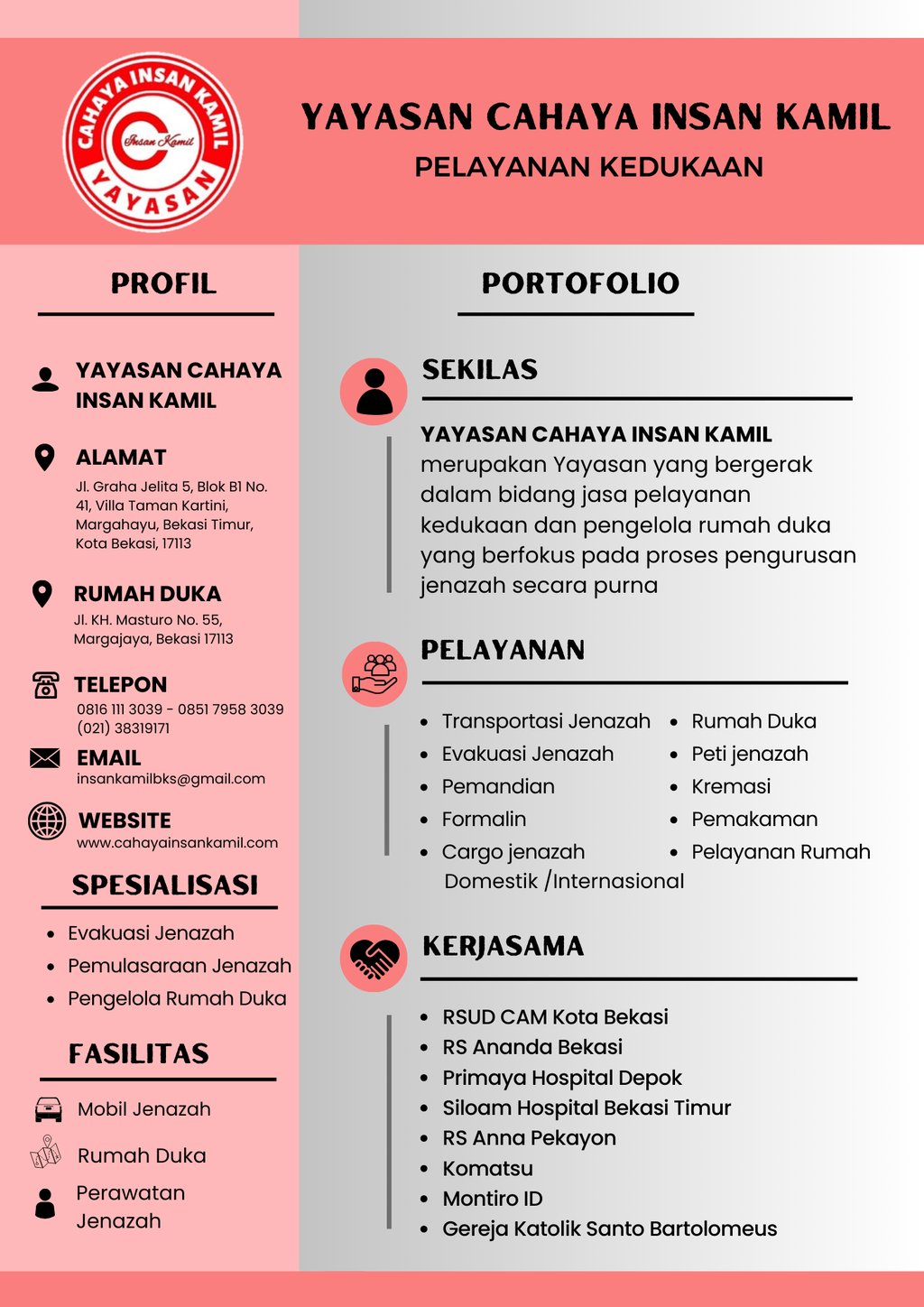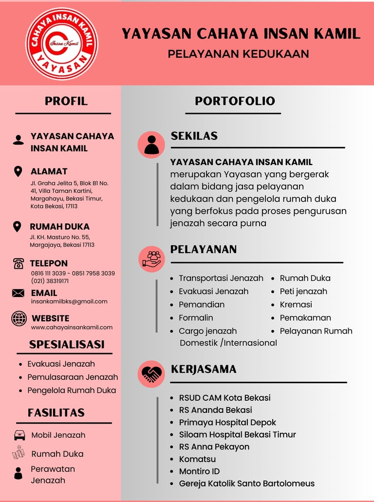 Seiring berjalannya waktu, Yayasan Cahaya Insan Kamil terus berkembang dengan pemikiran menambah berbagai kerjasama, seperti kerjasama dengan RSUD Chasbullah Abdulmadjid Kota Bekasi, untuk dapat melaksanakan Pengelolaan Rumah Duka, pemulasaraan dan perawatan jenazah secara purna.