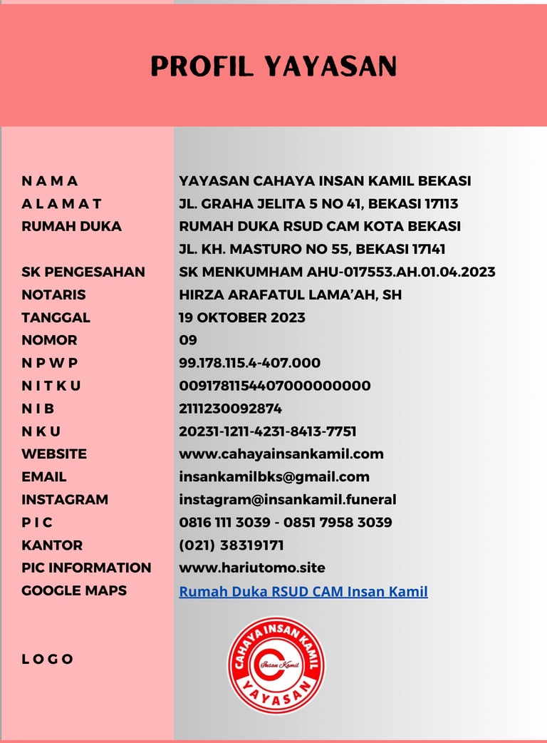 Yayasan Cahaya Insan Kamil didirikan pada tahun 2023 dengan misi dan visi untuk meningkatkan pelayanan kedukaan di lingkungan kota bekasi dan sekitarnya, Pendiri yayasan berinisiatif untuk membentuk sebuah lembaga yang dapat memberikan pelayanan kedukaan secara purna, dengan berbagai macam latar belakang adat istiadat dan agama.